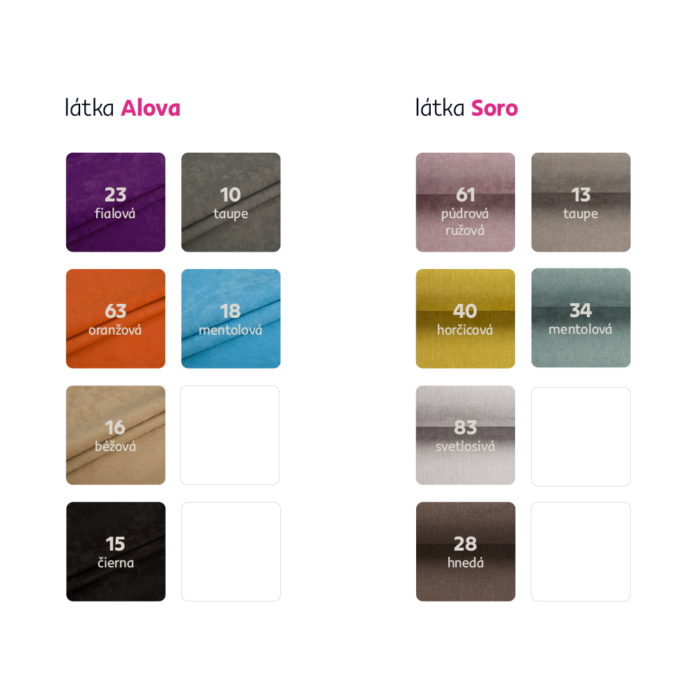 Možnosť objednania v 6 farebných prevedeniach látky alova v cene 259 Eur alebo látky Soro v cene 295 Eur. Pri individuálnej objednávke je potrebné zaplatiť 20% zálohu z danej sumy. Po uhradení zálohy bude Vaša požiadavka zadaná do výroby. Dodacia lehota 8-10 týždňov.