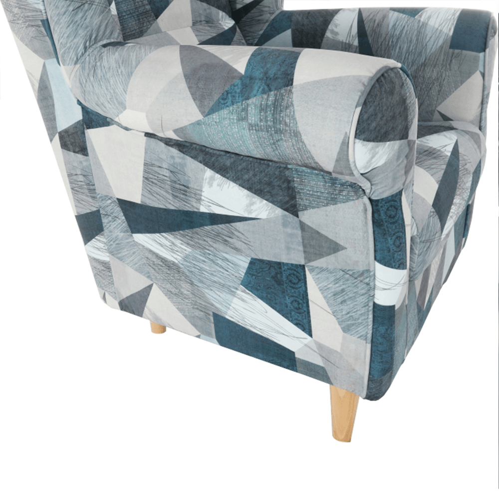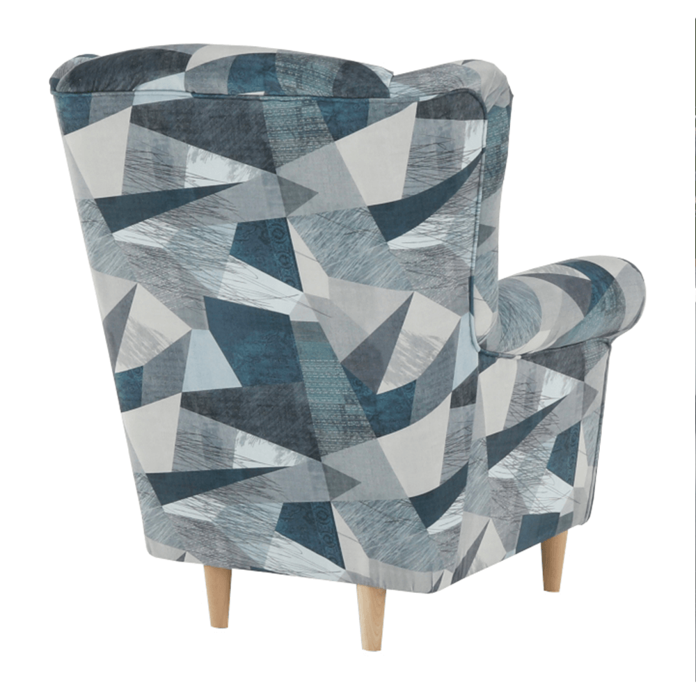 Kreslo-ušiak CHARLOT vo farebnom prevedení látky Holm sivomodrý vzor.