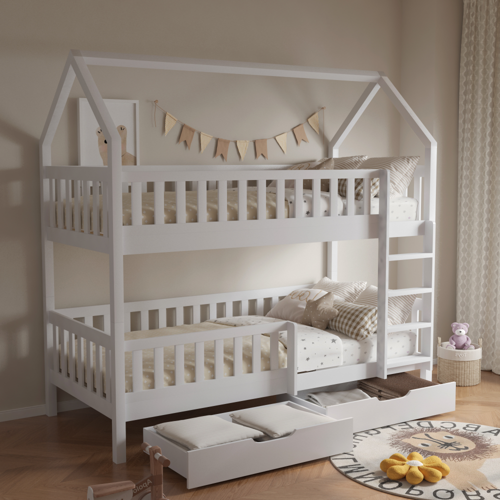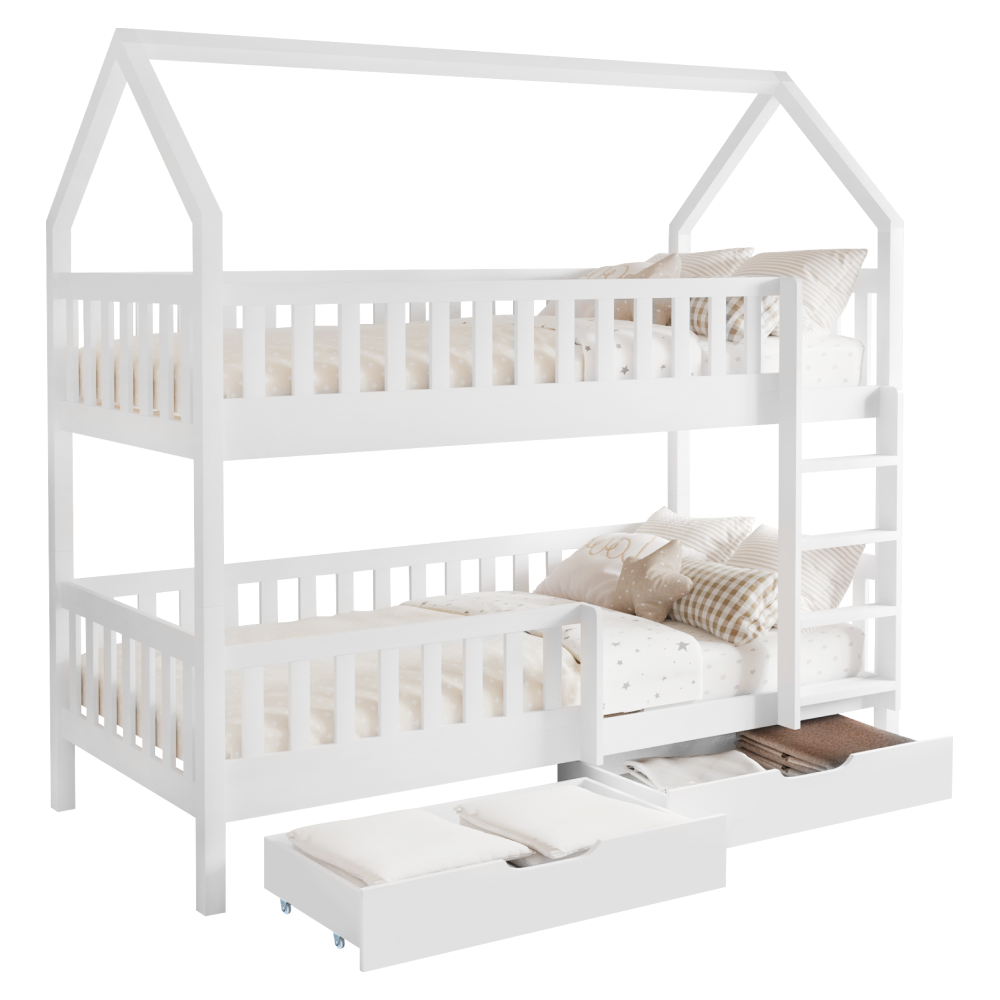 Poschodová posteľ VENITA TYP 2 v tvare domčeka je skvelým riešením do detských izieb, kombinuje funkčnosť, bezpečnosť a očarujúci dizajn. Je vyrobená z masívneho borovicového dreva v bielom farebnom prevedení, vďaka čomu sa ľahko prispôsobí akémukoľvek štýlu interiéru. Vďaka jednoduchému dizajnu a čistým líniám skvelo vynikne v akomkoľvek interiéri, a navyše je lakovaná ekologicky nezávadnými a umývateľnými farbami. Táto posteľ je vytvorená s dôrazom na pohodlie a bezpečnosť detí. Horné lôžko je vybavené ochrannou bariérou, ktorá zaisťuje maximálnu bezpečnosť počas spánku, dolné lôžko má taktiež praktickú bariérku proti pádu. Rebrík je možné namontovať na pravú alebo ľavú stranu, čím sa posteľ stáva univerzálnou. Disponuje aj dvomi veľkými zásuvkami na kolieskach, ideálne na uskladnenie hračiek, kníh alebo posteľnej bielizne. Zaujme vás aj jej funkcia rozložiteľnosti, vďaka ktorej ju rozložíte na dve samostatné lôžka. Posteľ je dodávaná s rolovanými roštami, ale bez matraca. K posteli odporúčame zakúpiť pružinové matrace v rozmere 90×200 cm z našej ponuky. Pridajte do detskej izby funkčný a štýlový kúsok nábytku, ktorý spĺňa všetky praktické požiadavky a poteší deti svojím rozprávkovým dizajnom!
