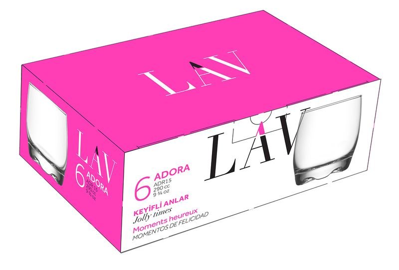 Sada obsahuje 6 kusov sklenených pohárov Adora s masívnym a špeciálne tvarovaným dnom zabezpečujúcim stabilitu. Poháre sú vhodné na podávanie whisky a iných alkoholických a nealkoholických nápojov. Rozmery pohára 77×88 mm, objem 290 ml.