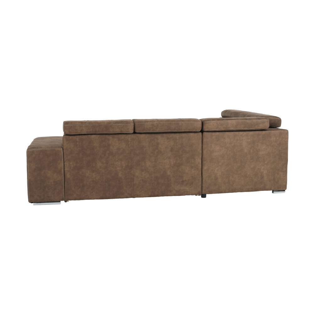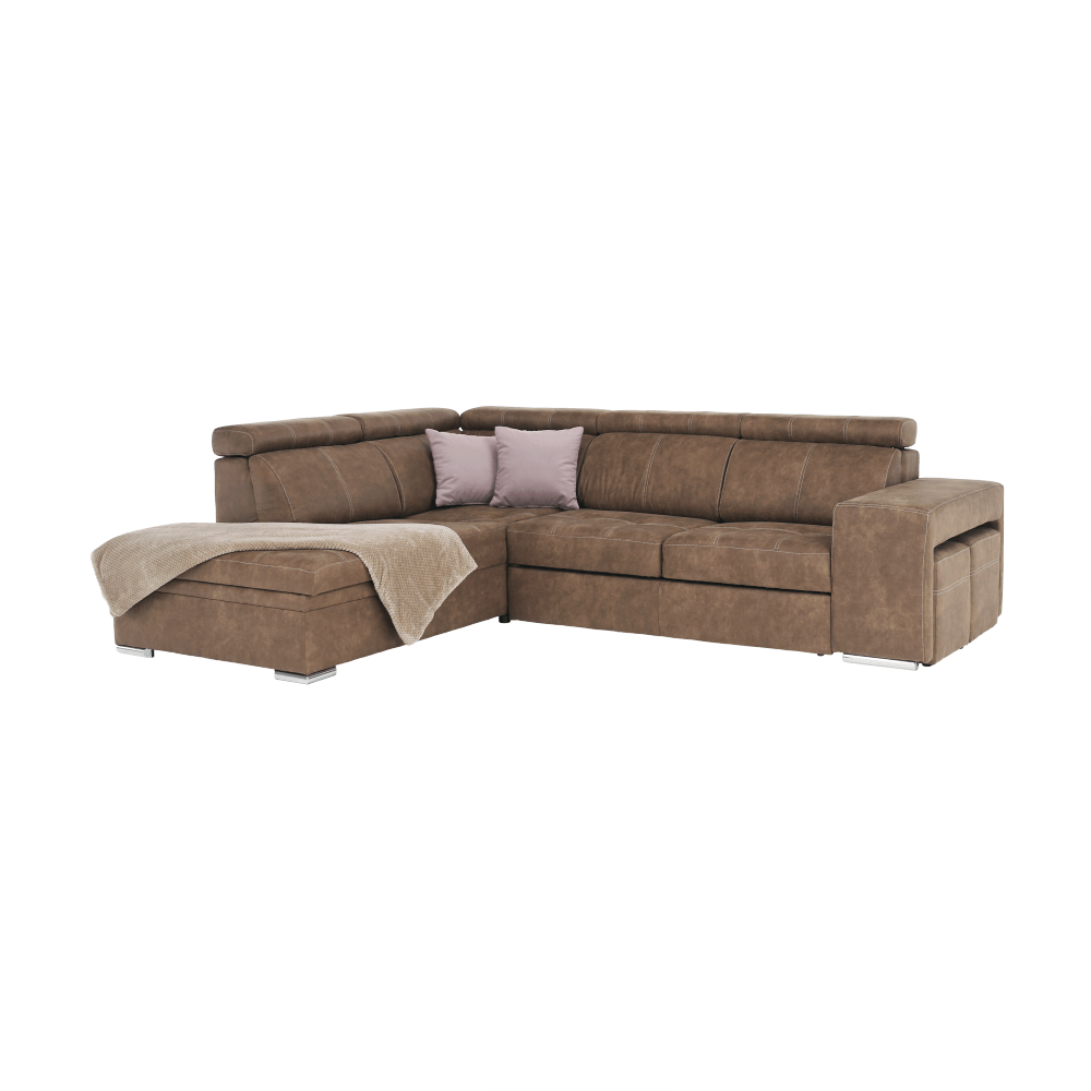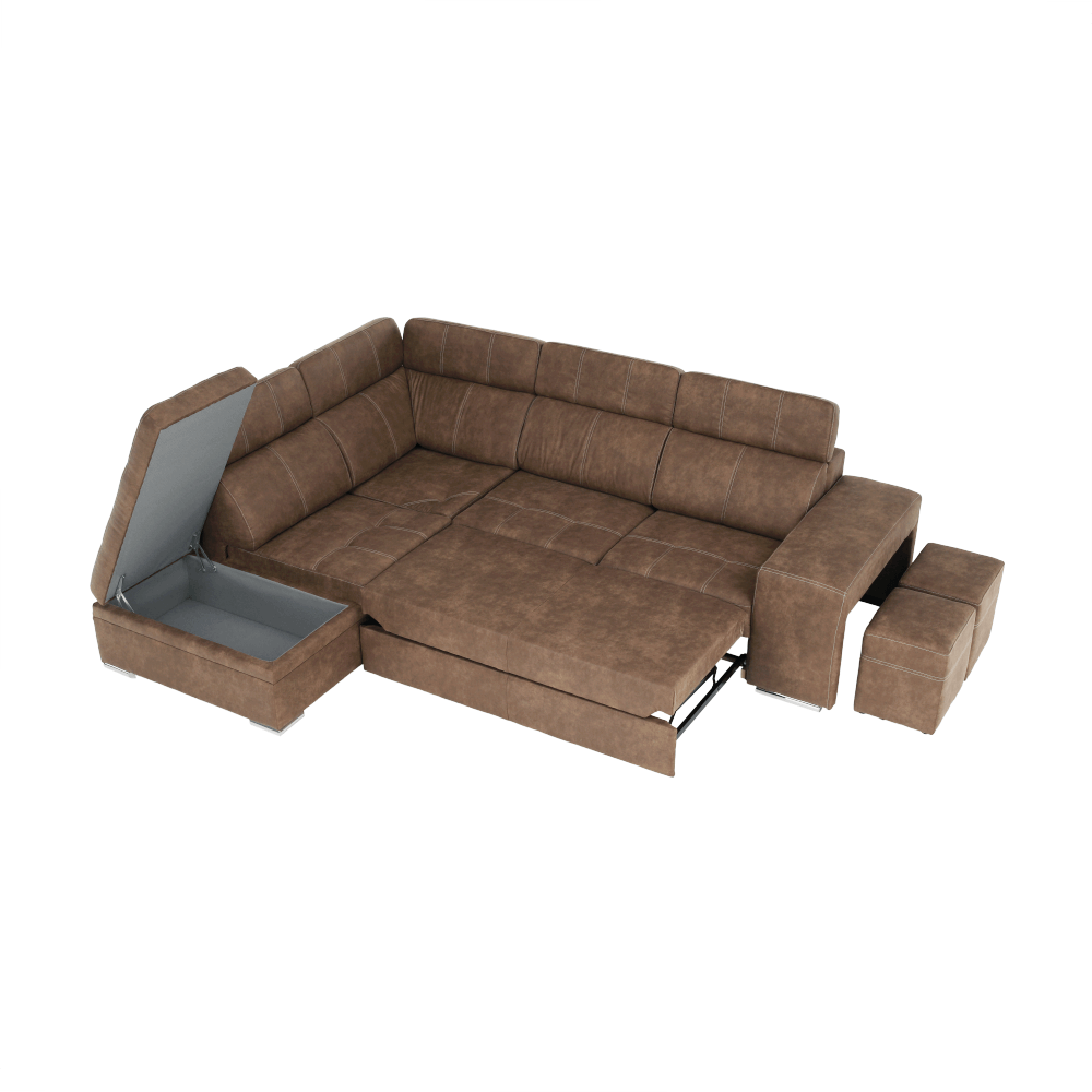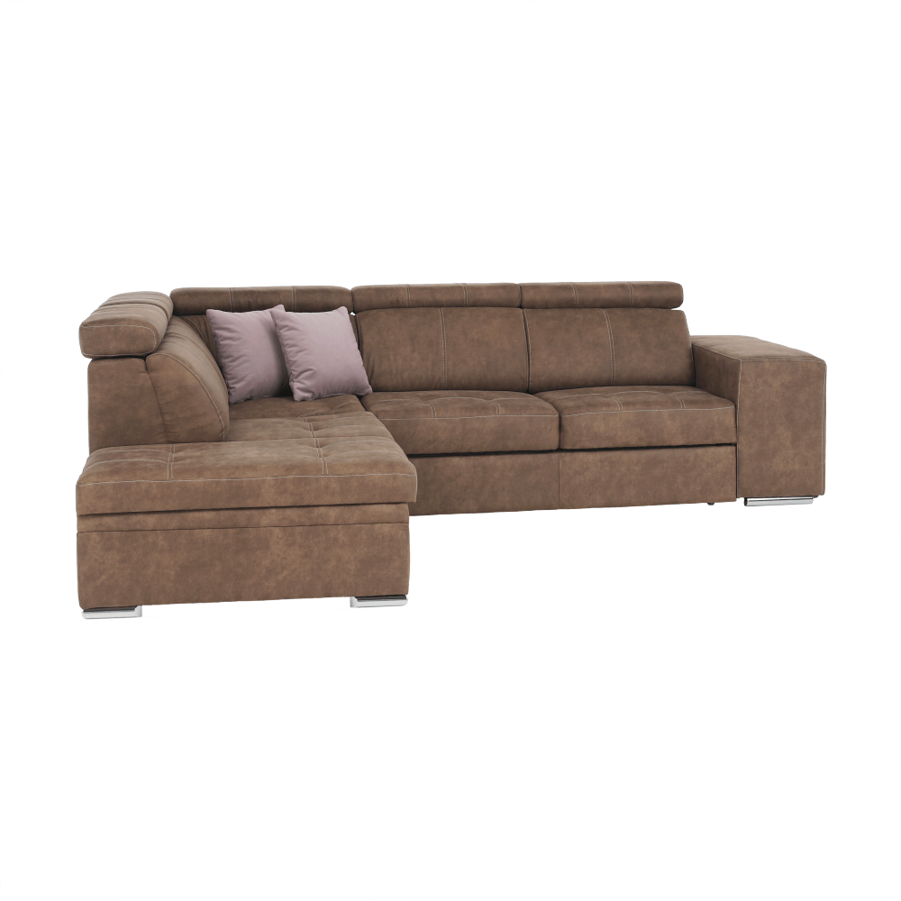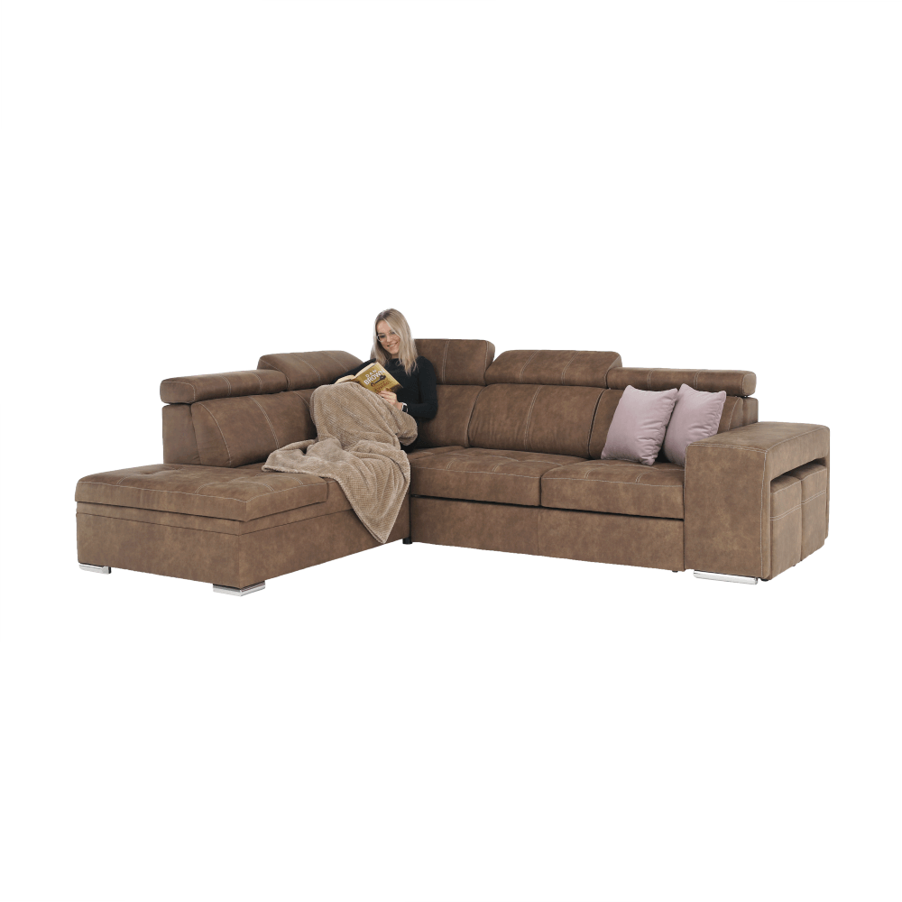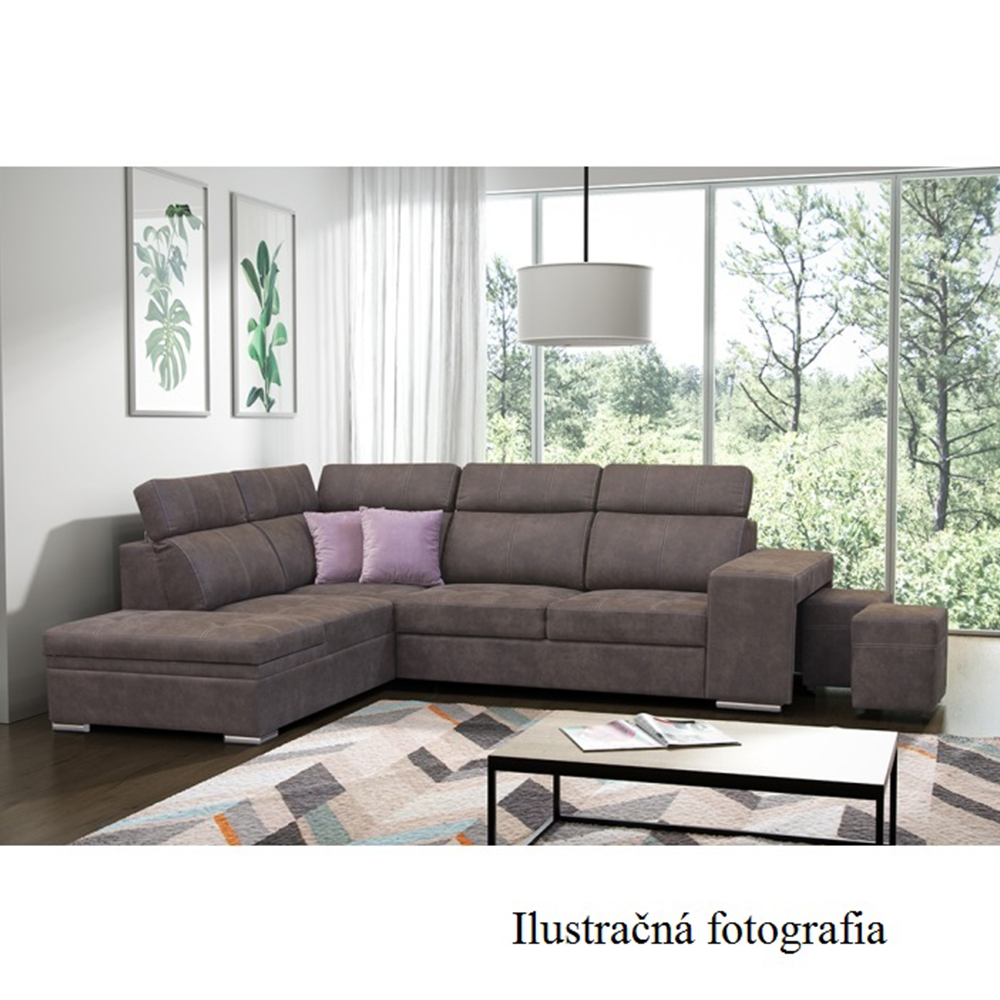 Celočalúnená rohová rozkladacia sedacia súprava s úložným priestorom a s polohovacím záhlavím.
