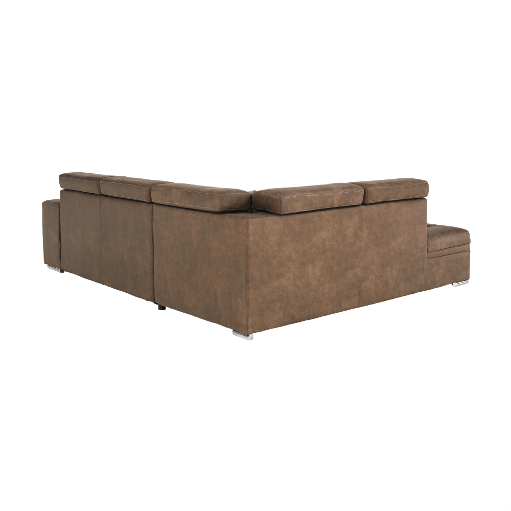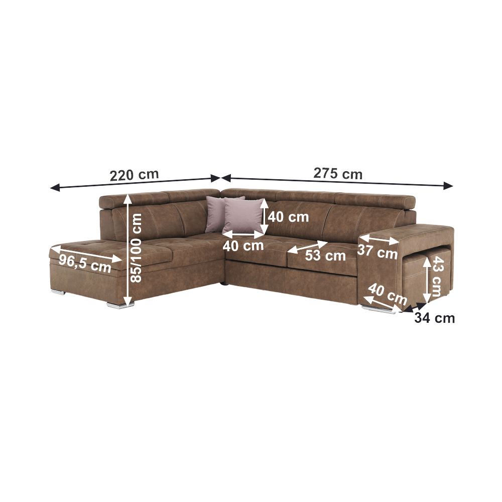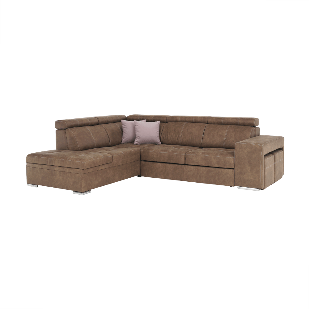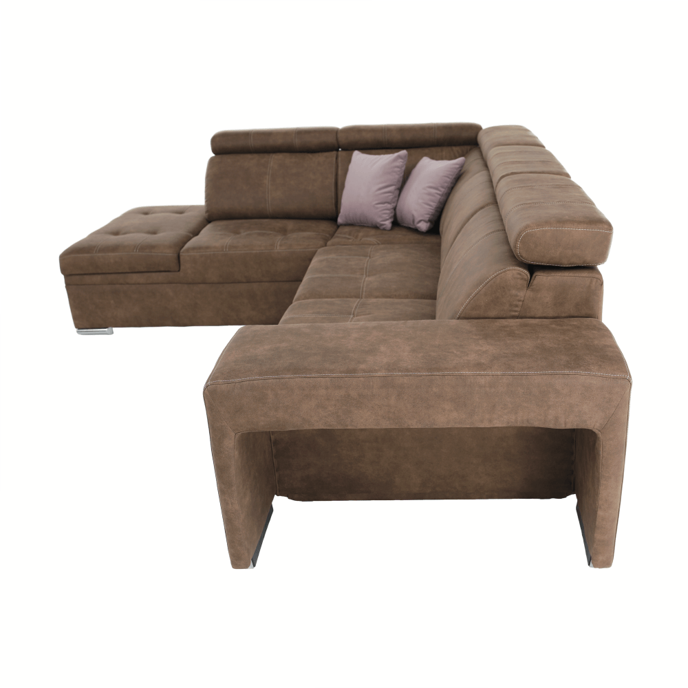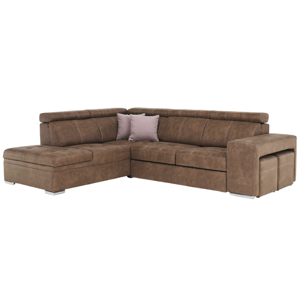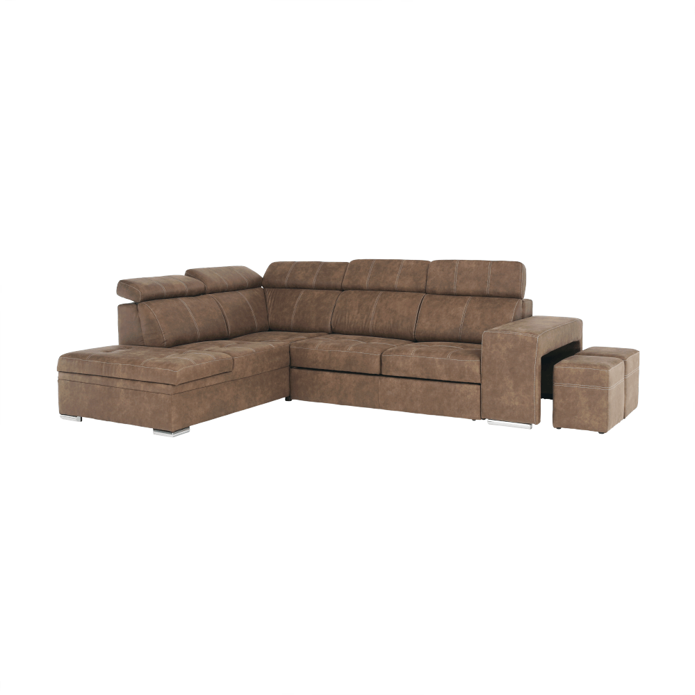 Celočalúnená rohová rozkladacia sedacia súprava s úložným priestorom a s polohovacím záhlavím.