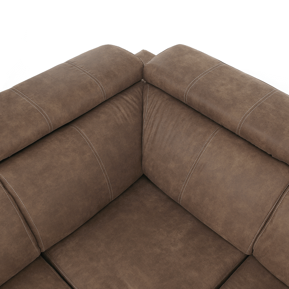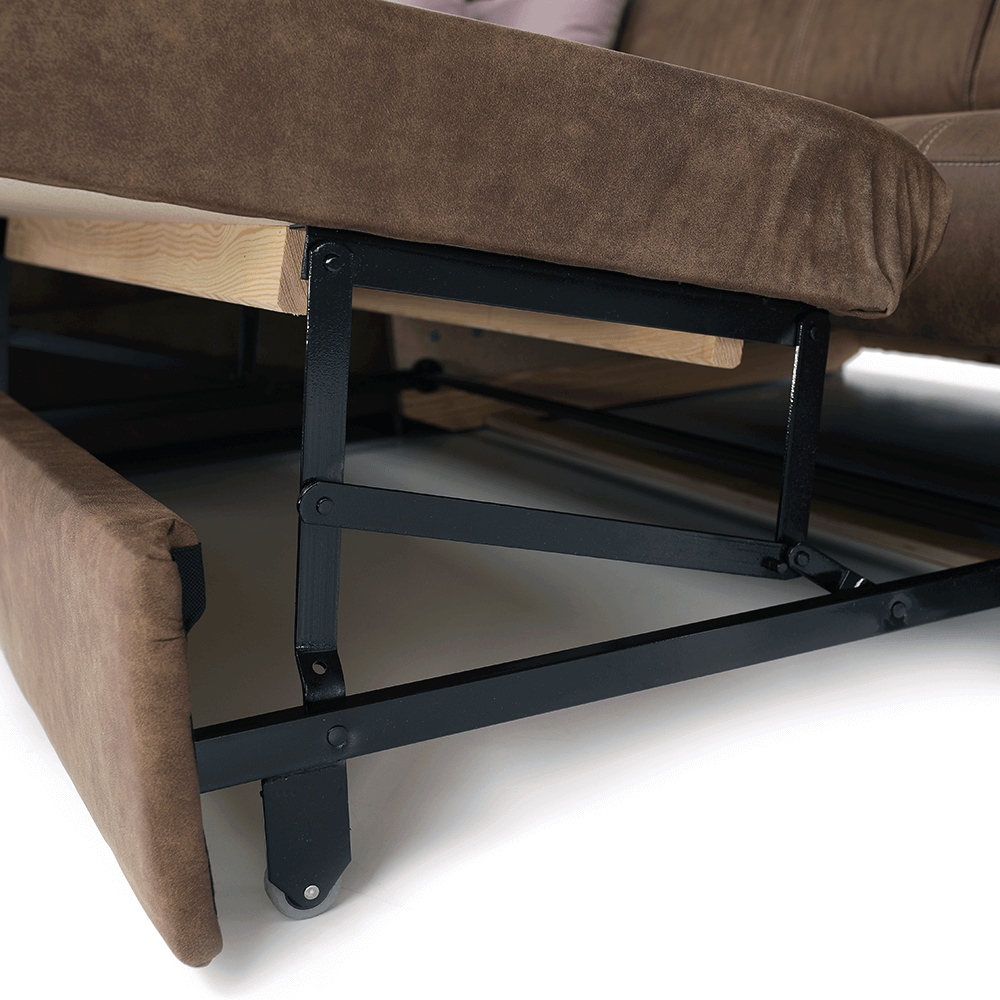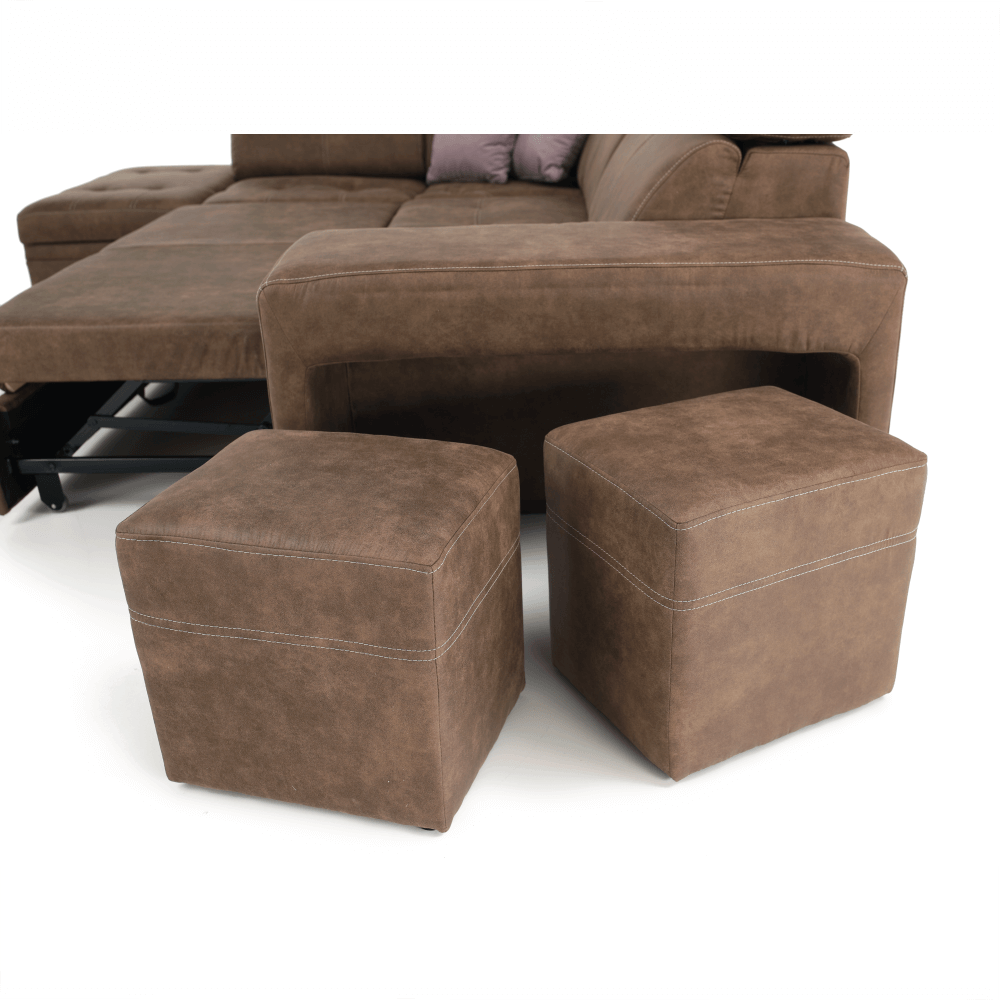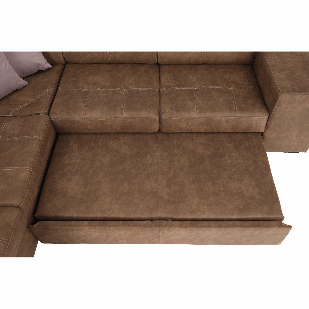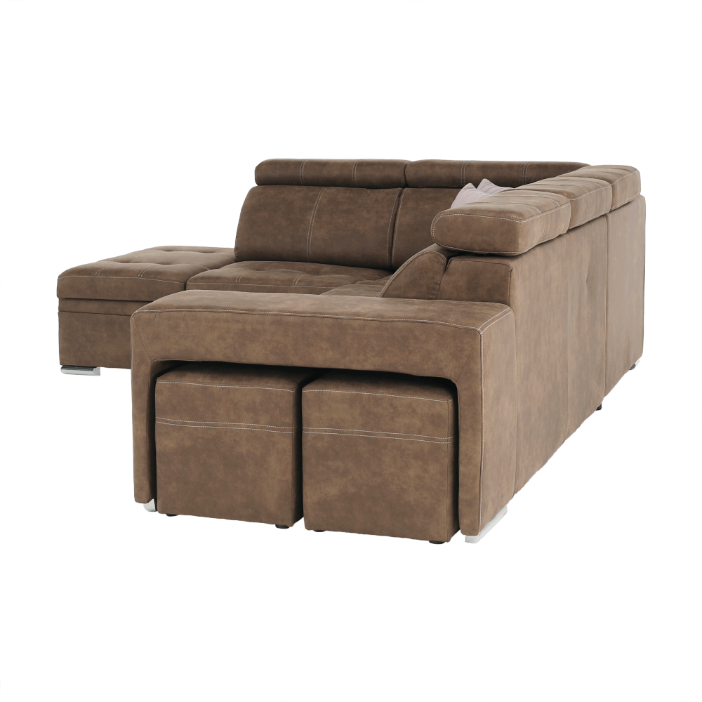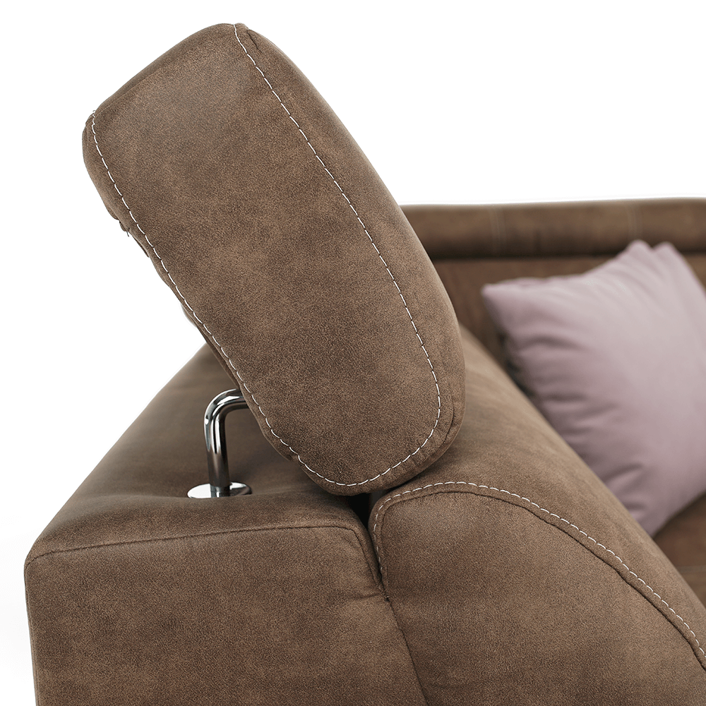 Celočalúnená rohová rozkladacia sedacia súprava s úložným priestorom a s polohovacím záhlavím.