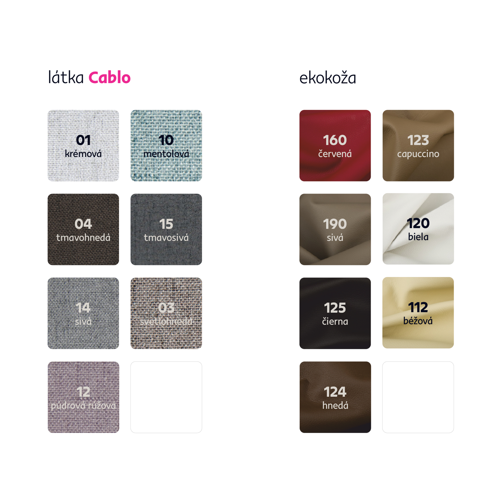 Ponúkame vám možnosť zvoliť si farebný odtieň zo siedmich farieb látky Cablo a zo siedmich farieb ekokože. Odtiene nájdete v priloženom vzorkovníku. Výber farebného odtieňa poznačte pri objednávaní priamo do poznámky. Pri individuálnej objednávke je potrebné zaplatiť 20% zálohu z danej sumy. Po uhradení zálohy bude Vaša požiadavka zadaná do výroby. Doba dodania 6-8 týždňov. Cena takto zloženej sedačky v inej farbe závisí od počtu jednotlivých dielov, ktoré ju tvoria. Odporúčame preveriť si konečnú cenu.