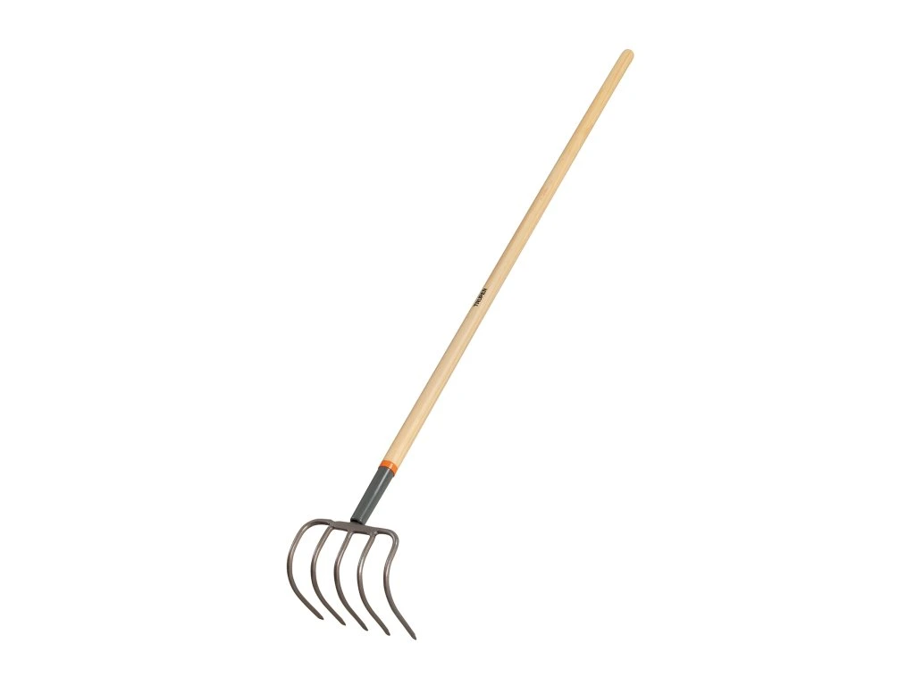 Záhradný kultivátor TRUPER CUL-5: štvorramenný kovaný kultivátor s drevenou rukoväťou na kyprenie pôdy a odstraňovanie buriny.