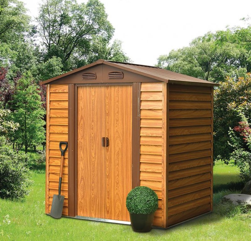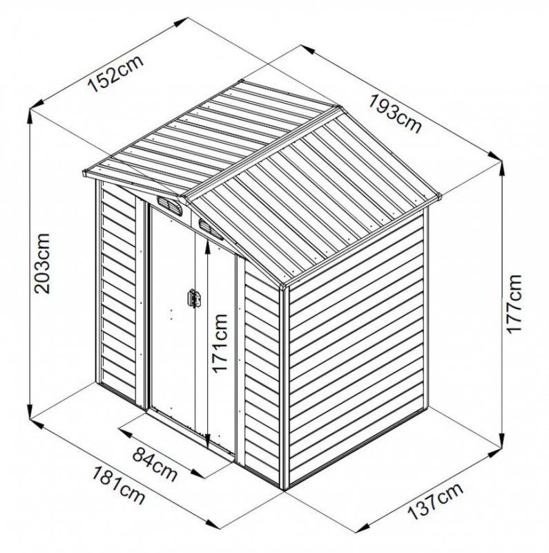 Záhradný domček Furnee poskytuje dostatočne veľký priestor na uskladnenie záhradného náradia, vybavenia, nábytku či bicyklov. Je vyrobený z vysokokvalitného kovu, ktorý je odolný voči korózii. Otváranie pomocou dvojitých posuvných dverí. Disponuje 4 ventilačnými otvormi pre lepšie prúdenie vzduchu. Skvele sa hodí na akýkoľvek dvor, kde plní nielen praktickú, ale aj estetickú funkciou. Možnosť dokúpenia podlahovej konštrukcie. Farba: hnedá. Rozmery s presahom strechy (Š x D x V): 193x152x203 cm. Rozmery pôdorisu (Š x D): 181 x 137 cm. Všetky rozmery sú na obrázku. Veľkosť dverí: 84 x 171 cm. Hrúbka lakovaného plechu: 0,25 mm, hrúbka pozinkovaného rámu: 0,6 mm.