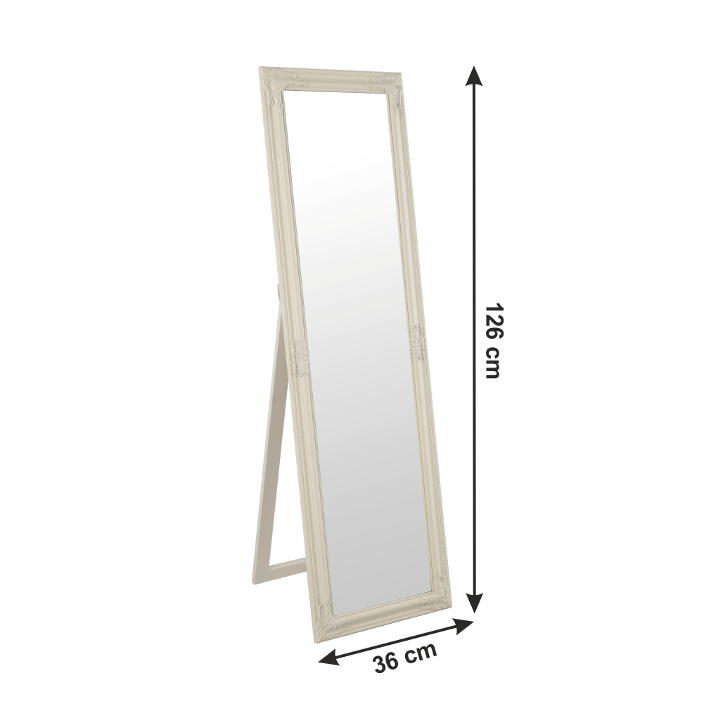 Elegantné zrkadlo s dreveným rámom smotanovej farby.